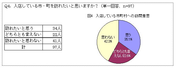「とれたて村」に入店している市町村への訪問意思を尋ねたところ、「訪ねたいと思う」が35.1%、「訪ねたいと思わない」は42.3%であった。
