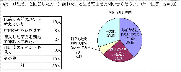 次に、「訪ねたいと思う」と回答した来店者に、その理由を尋ねたところ「以前から訪ねたいと考えていた」が39.4%と最も多い。また、「とれたて村」での買い物が市町村訪問の動機付けになったとみられる「店内のチラシを見て」は24.2%、「購入した商品を現地で味わってみたい」が6.1%となった。「その他」には「自分・家族の故郷だから」「地方に憧れる」などの回答がある。